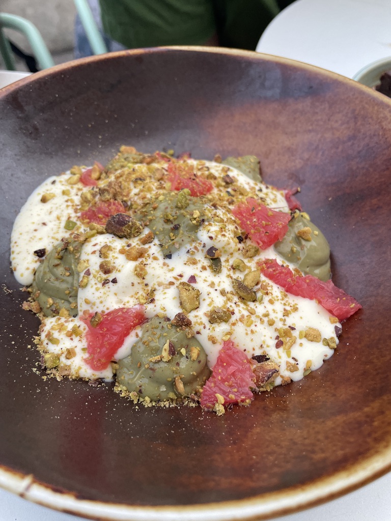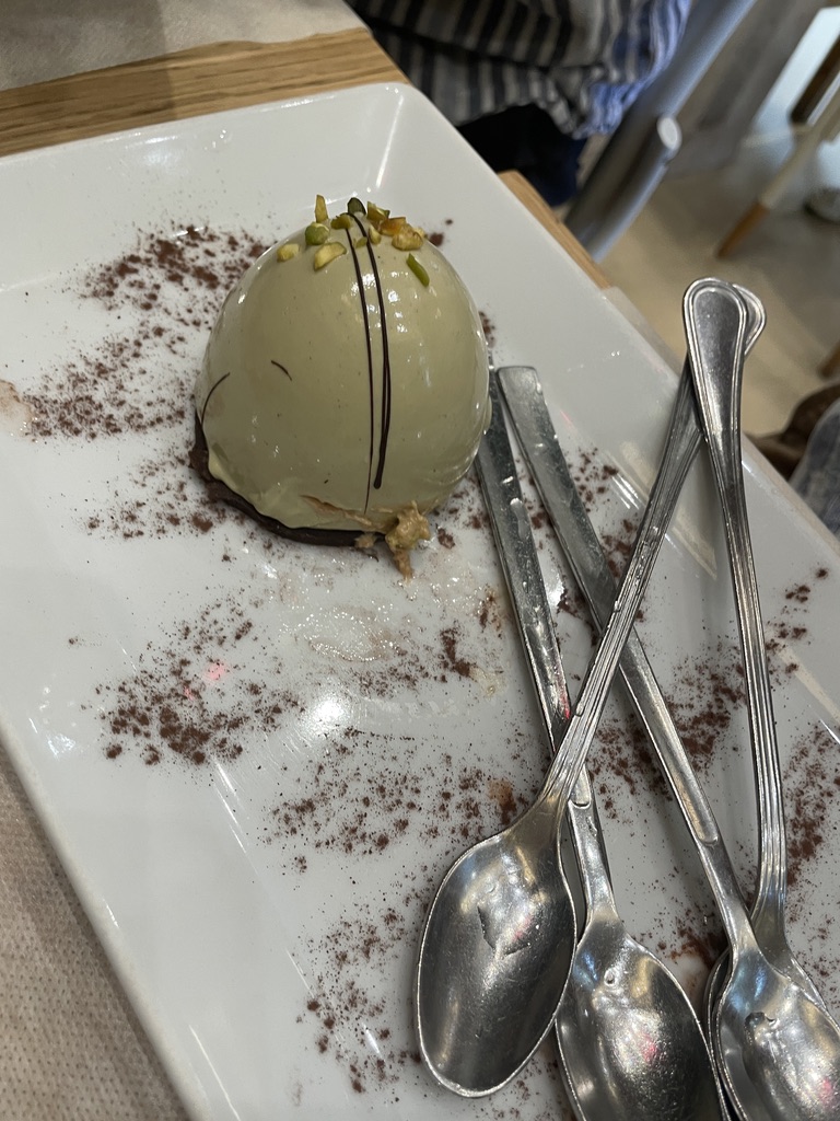 We proceeded to have a lovely meal, and even tried escargots, which were not as bad as I expected, but I don’t know if I would necessarily order them again. We thanked the owner profusely and made a quick exit, and then relaxed in the hotel, until we left for T’s birthday dinner. Remember how I said I loved sweet treats? Here we had the most delicious one of our trip: an almond crumble with pistachio and orange blossom cream, topped with grapefruit slices. The flavors were perfectly balanced and we did our very best to savor every bite.